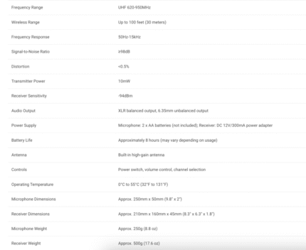 Battery Life: 10H (mic) + 30H (case) = 40H total Wireless Range: Up to 200ft (60m) (open area) Noise Cancellation: 2-stage advanced filtering Compatibility: iPhone 8/X/11/12/13/14, iPad (Lightning port) Charging: USB-C charging case, RX phone charging support 7 days replacement warranty