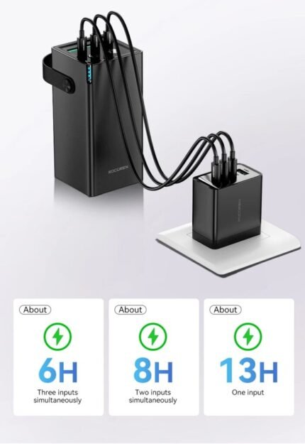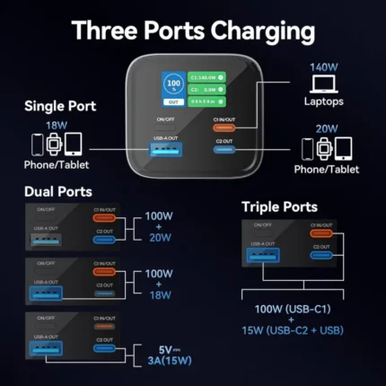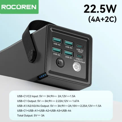 Massive 40000mAh lithium battery for long-lasting power Dual Type-C and dual USB-A ports for wide compatibility 22.5W fast charging via USB-A1; 20W fast charging via Type-C Smart output distribution for efficient multi-device charging Built-in 360° LED lighting with RGB mode and 3 brightness settings Rugged V1+PC build with silicone-covered ports for durability Compact, handheld design with portable convenience 7 days warranty