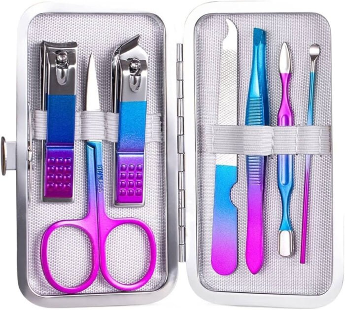 7-Piece Set: Includes flat mouth nail scissors, diagonal nail scissors, eyebrow scissors, nail file, eyebrow clip, two shovels, and ear scoop.