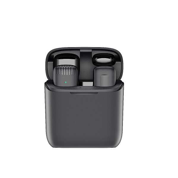 This product is a smart wireless microphone that provides professional-grade recording output. Plug and play, no app required. Multiple uses: It can be used in online live broadcasts, video Vlog shooting, program interviews, cording, video teaching, and other occasions. This product consists of three parts: a charging box, microphone transmitting end, and receiving end.